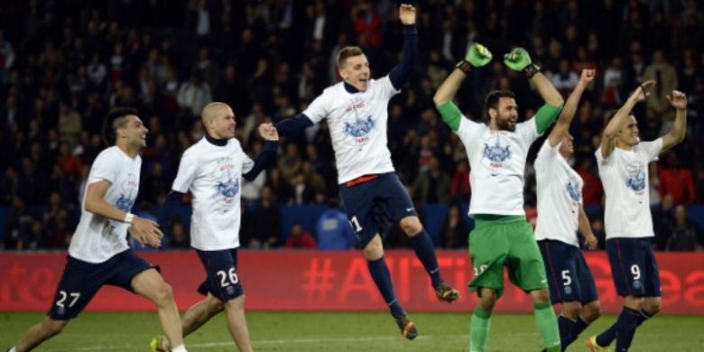 Paris Saint-Germain (PSG) menyerah 1-2 saat menjamu Rennes di Stadion Parc des Princes, Paris, Rabu (7/5/2014). Meski demikian, para pemain PSG tetap bergembira karena sebelum pertandingan itu mereka sudah tak mungkin dikejar siapa pun dalam perburuan gelar Ligue-1.